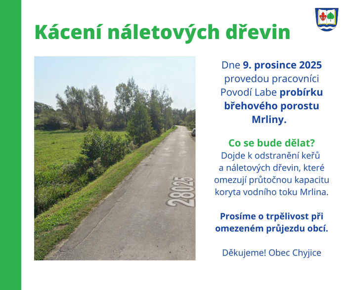 Zítra 9. prosince 2025 budou pracovníci Povodí Labe provádět probírku břehového porostu vodního toku Mrlina. Jde o úsek od vjezdu do obce směrem od Dolan až k obecnímu úřadu.