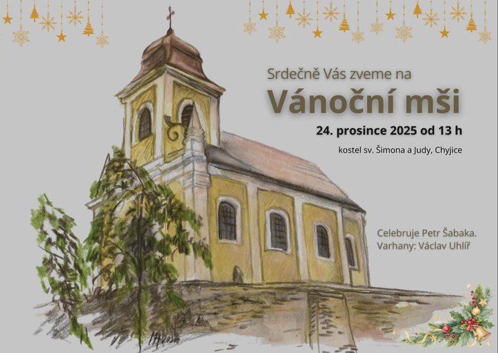 Vážení občané, zveme Vás na tradiční Vánoční mši do kostela sv. Šimona a Judy v Chyjicích. Mše začíná ve 13 hodin, celebruje kaplan Petr Šabaka, na varhany hraje Václav Uhlíř.